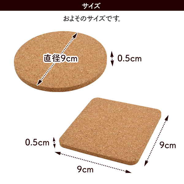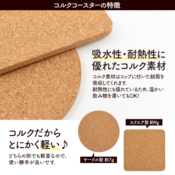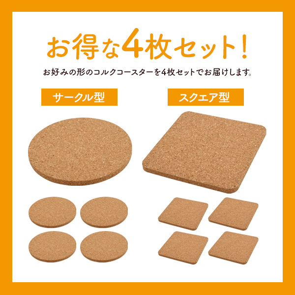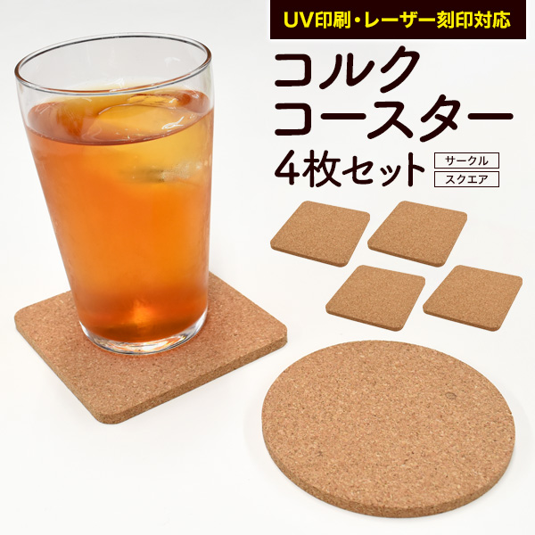 ぬくもりを感じるコルク素材で作られています。 両面UV印刷に対応しているため、UVプリンターを使用して オリジナルのコースターを作成することができます。 レーザー刻印にも対応しているため、摩擦に強く消えにくい加工が可能です。 吸水性・耐熱性に優れたコルク素材は冷たい飲み物以外に温かい飲み物を置いてもOK! クッション性があるため、コップを置いた時の音が響きません。 厚さはしっかりと厚みのある0.5cm サークル型約7g、スクエア型約9gとどちらの形でも軽量なので使い勝手が良いです。 お得な4枚セットです。 ※このページはスクエア型用の販売ページです。 サークル型はお手数ですが専用ページよりお買い求めください。 | ||||||||||||||