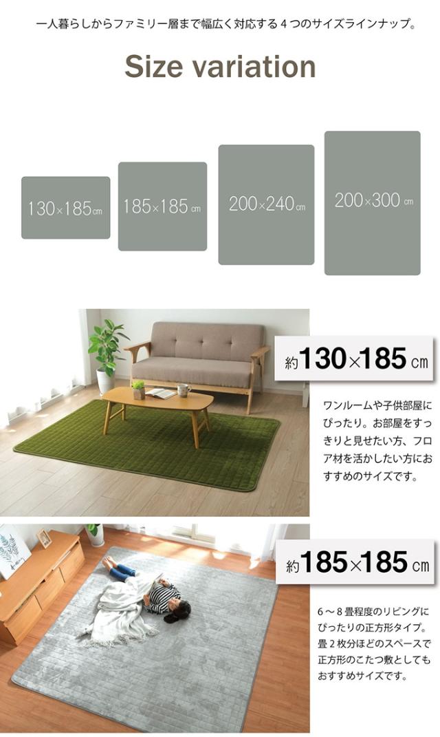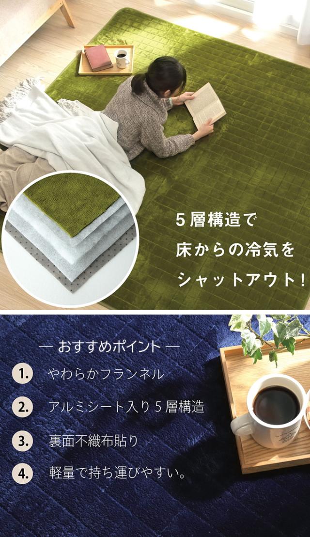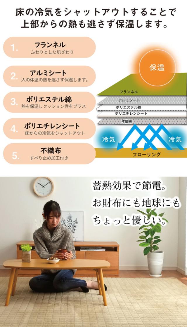 ずっと触っていたくなるようなやわらかな肌触りのフランネルキルトラグ。 中材にアルミシート・ポリエチレンシートを使用することで蓄熱・断熱機能があるため、冬の寒い日でも床からの底冷えを軽減します。 5層構造により床からの冷気だけでなく表からの熱も逃さず保温。 こたつ敷にもおすすめです。 裏面は不織布貼りの滑り止め付きなのでフローリングでも安心。 薄手で軽量なのでコンパクトに収納ができます。 手洗いでお洗濯可能なのでいつでも清潔にご使用いただけます。 ※洗濯機は使用できません。※ ※必ず洗濯表示をご確認ください。※ ■洗えるラグ レイヤーの他のサイズはこちら↓ 【1.5畳サイズ 130×185cm】 【2畳サイズ 185×185cm】 ■その他のカーペット・マットはこちら↓ カーペット・マット |