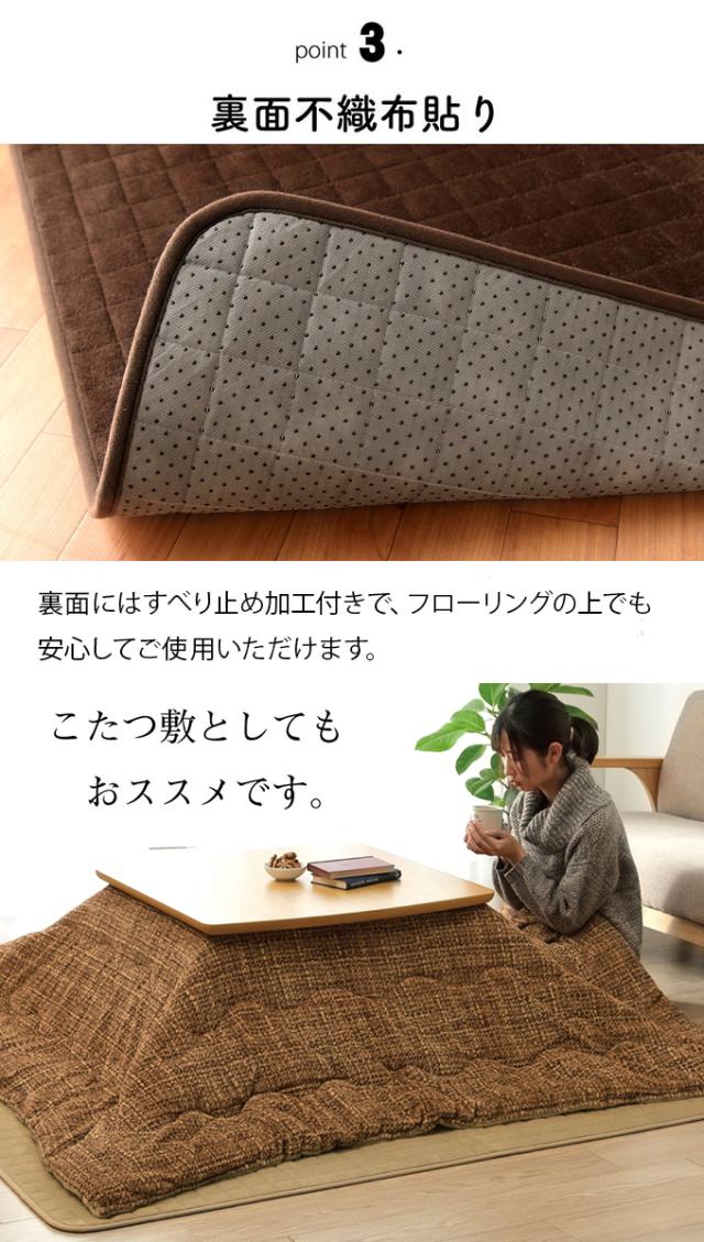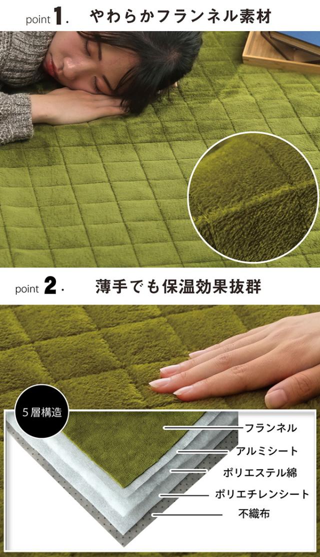 表地=ポリエステル100%【フランネル】 裏地=ポリエステル100%【滑り止め付き】 中材=アルミシート+ポリエステル綿+ポリエチレンシート3mm |