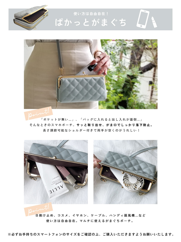 フロント部分のがま口ポケットはスマートフォンを入れることができ、