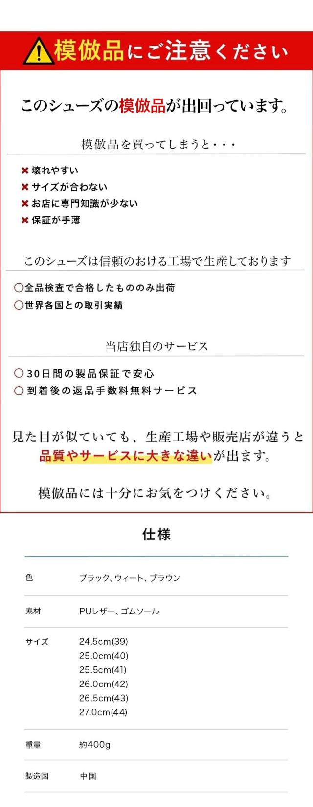 素材:アッパー/PUレザー、ソール/ラバー サイズ: 24.5cm(39) 25cm(40) 25.5cm(41) 26.0cm(42) 26.5cm(43) 27cm(44) カラー:ブラック(BLACK)、イエロー(YELLOW)、ブラウン(BROWN) |