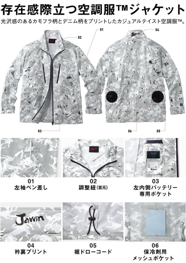 光沢感のあるカモフラ柄とデニム柄をプリントしたカジュアルテイスト空調服。