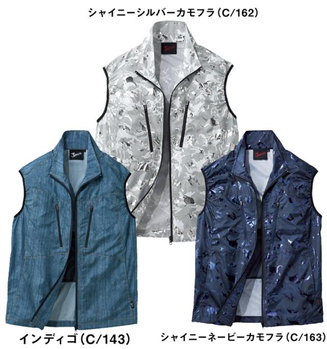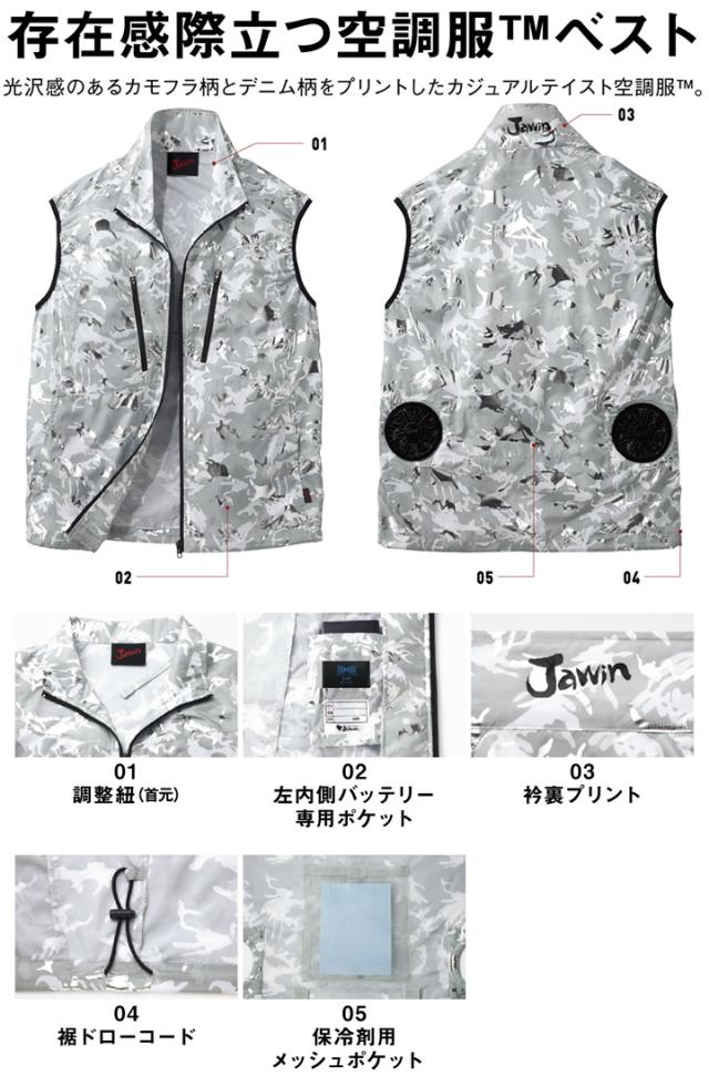 光沢感のあるカモフラ柄とデニム柄をプリントしたカジュアルテイスト空調服。
