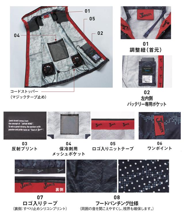 ロゴ入りニットテープとプリントがJawin の存在感を際立てる。デジタルカモフラージュ柄の空調服ベスト。