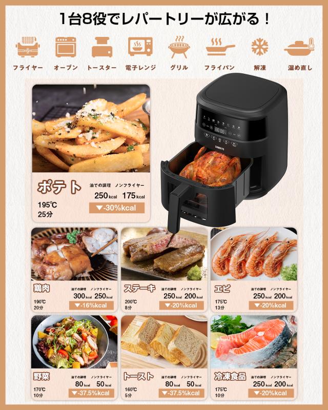 ・ノンフライに加え、グリル、オーブン、トースター、電子レンジ、ライトパン、解凍、温め直し、1台8役もこなすスグレモノ