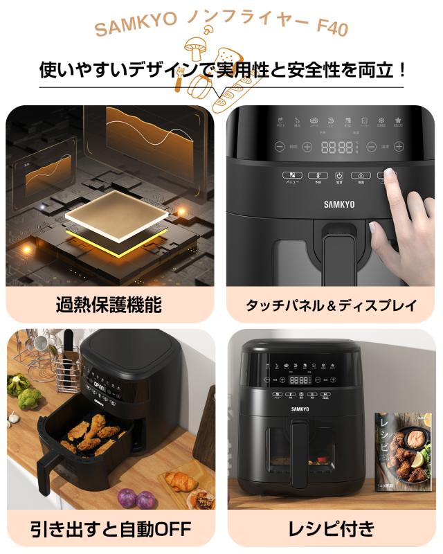・ノンフライヤー「F40」は、「360°熱風循環」技術により、油を使わず空気の熱で食材を揚げます。