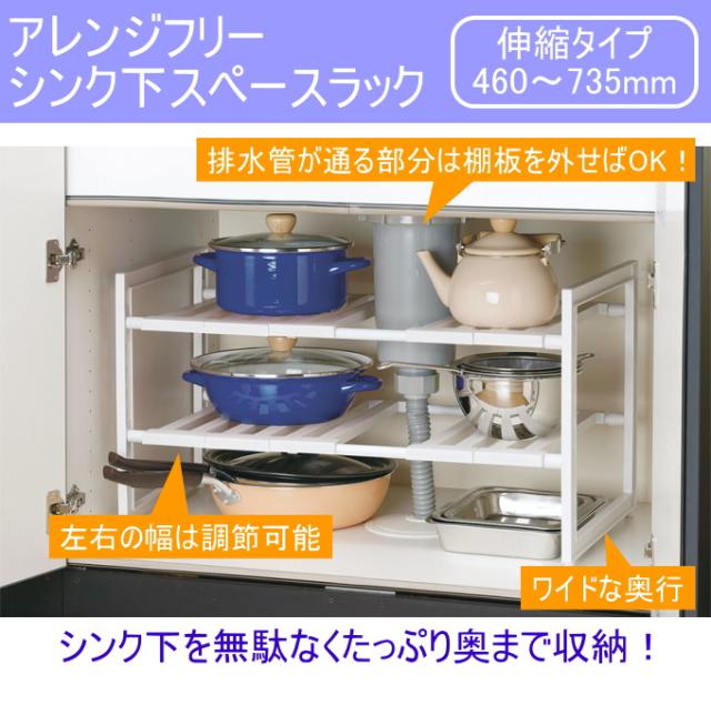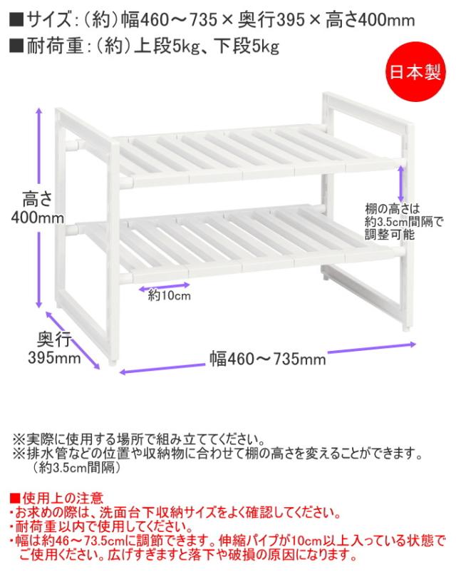 アレンジフリー シンク下スペースラック 2段ワイド 伸縮タイプ460〜735 H-5799 日本製 収納 シンク下 台所 キッチン キッチン収納 伸縮 ラック 組立式