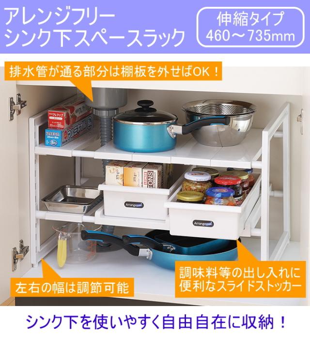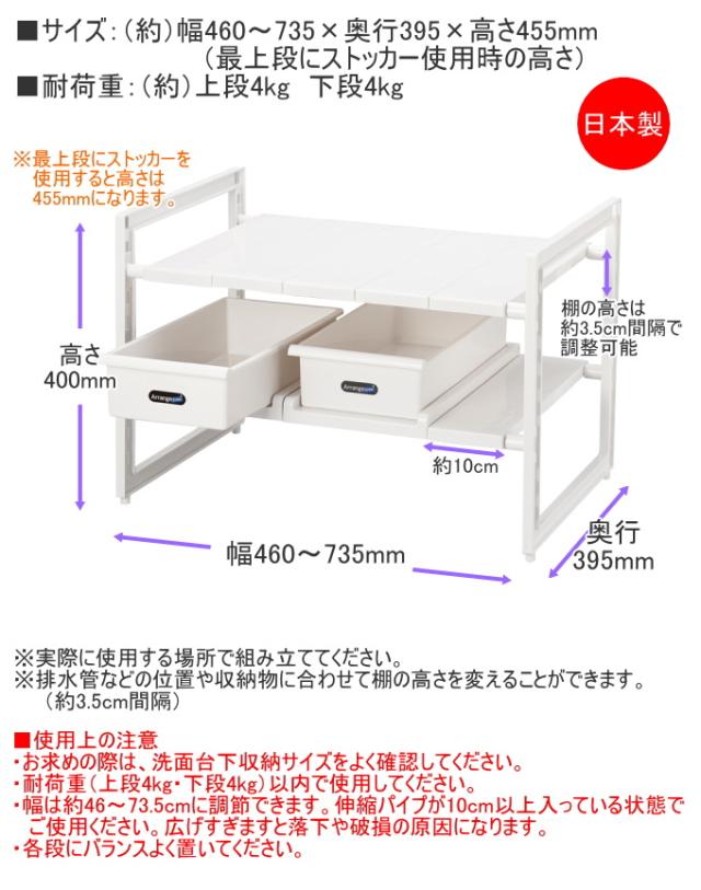 アレンジフリー シンク下スペースラック 2段 ストッカー付伸縮タイプ460〜735 H-5809 日本製 シンク下 台所 キッチン収納 ストッカー付き 伸縮 ラック 組立式