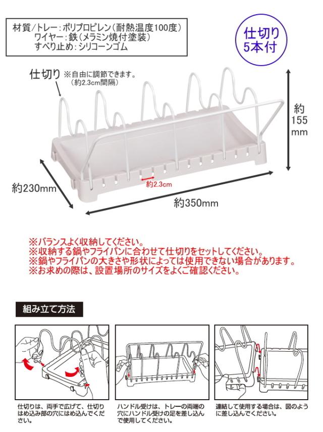 ・火のそばに置かないでください。 ・不安定な状態や場所での使用は避けてください。 ・バランスよく収納してください。 ・収納する鍋やフライパンに合わせて仕切りをセットしてください。 ・鍋やフライパンの大きさや形状によっては使用できない場合があります。 ・お求めの際は、設置場所のサイズをよく確認してください。 |
