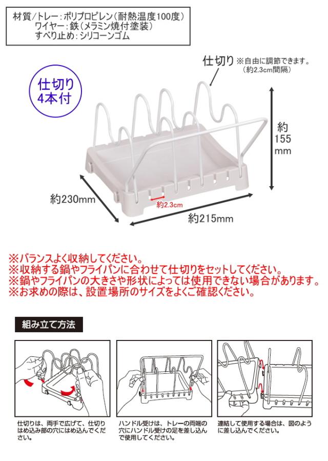 ・火のそばに置かないでください。 ・不安定な状態や場所での使用は避けてください。 ・バランスよく収納してください。 ・収納する鍋やフライパンに合わせて仕切りをセットしてください。 ・鍋やフライパンの大きさや形状によっては使用できない場合があります。 ・お求めの際は、設置場所のサイズをよく確認してください。 |