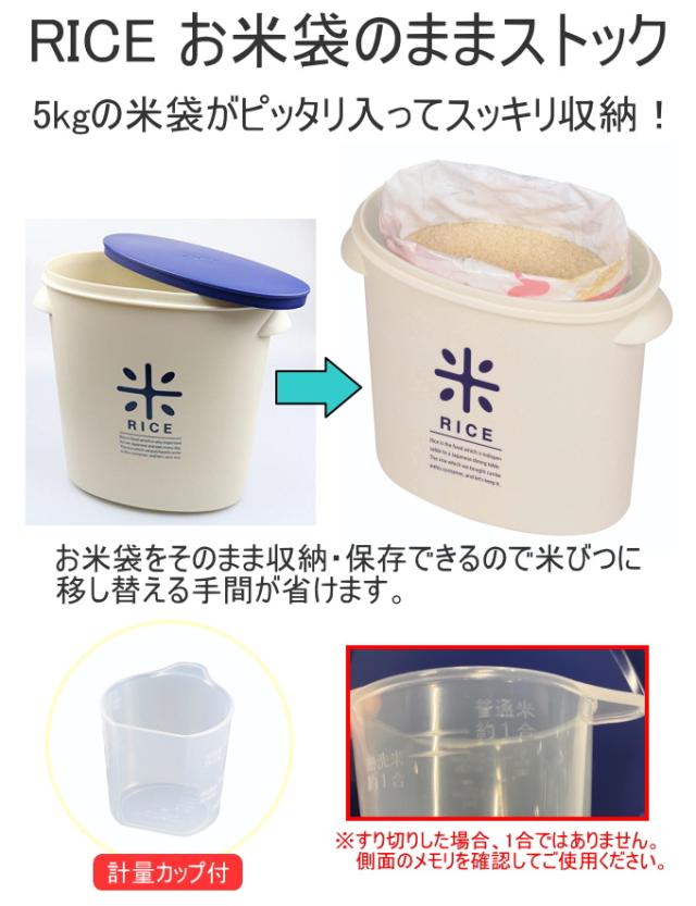 RICE お米袋のままストック 5kg用 計量カップ付き 日本製 米櫃 米びつ 保管 米 収納 保存 米袋 キッチン 収納