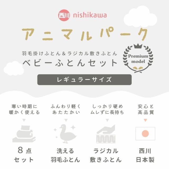 [ keyword | 西川 ベビー布団セット 日本製 レギュラーサイズ 羽毛布団 ラジカル敷き布団 ベビー組布団8点セット ベビー布団 アニマルパーク ベビー 布団セット 綿100% カバー ローズラジカル敷きふとん 固綿 おすすめ 日本製 出産 男の子 女の子 刺繍 かわいい ]