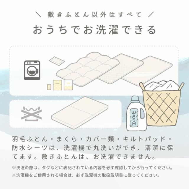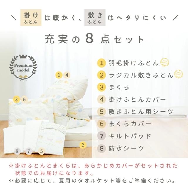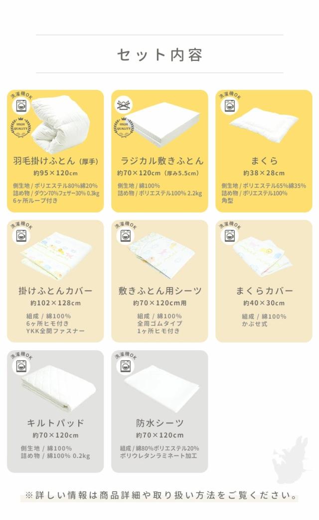 | セット内容 | 羽毛掛けふとん / ラジカル敷きふとん / まくら / 掛けふとんカバー / 敷きふとん用シーツ / まくらカバー / キルトパッド / 防水シーツ | |||
