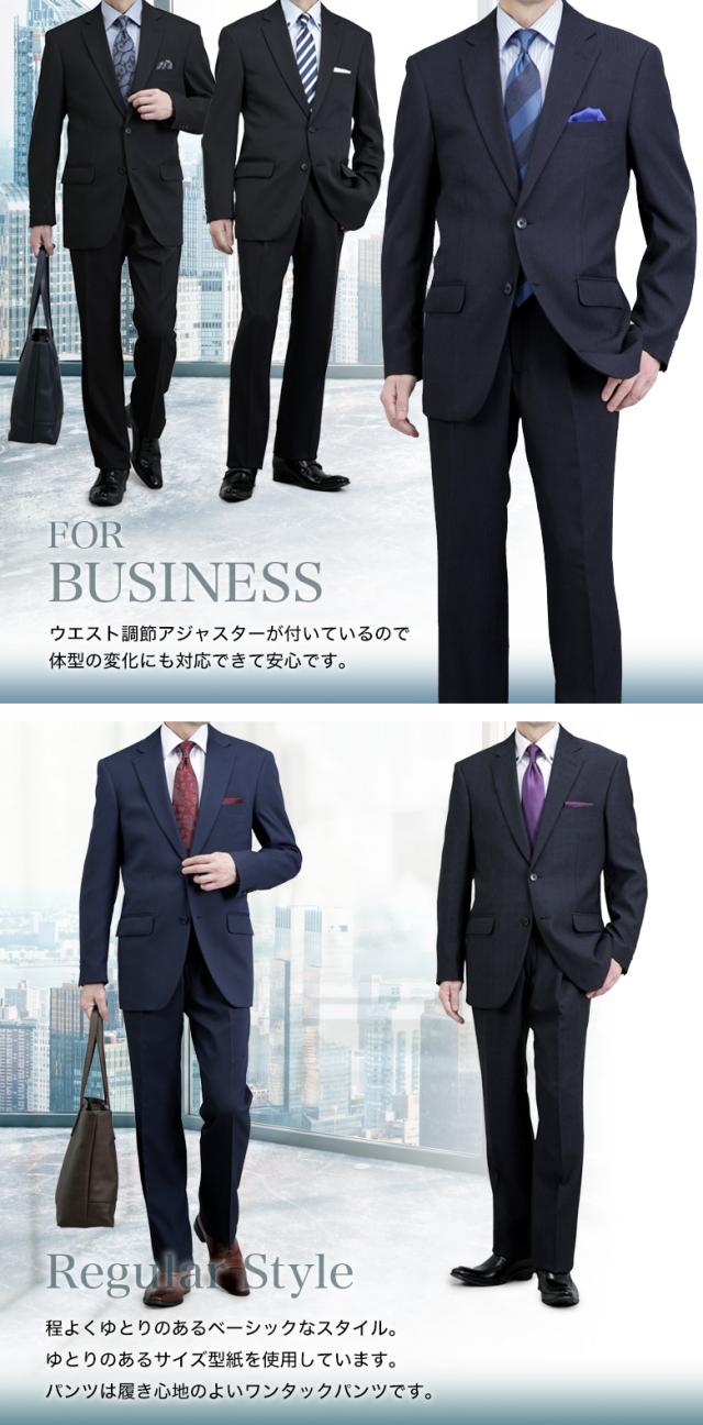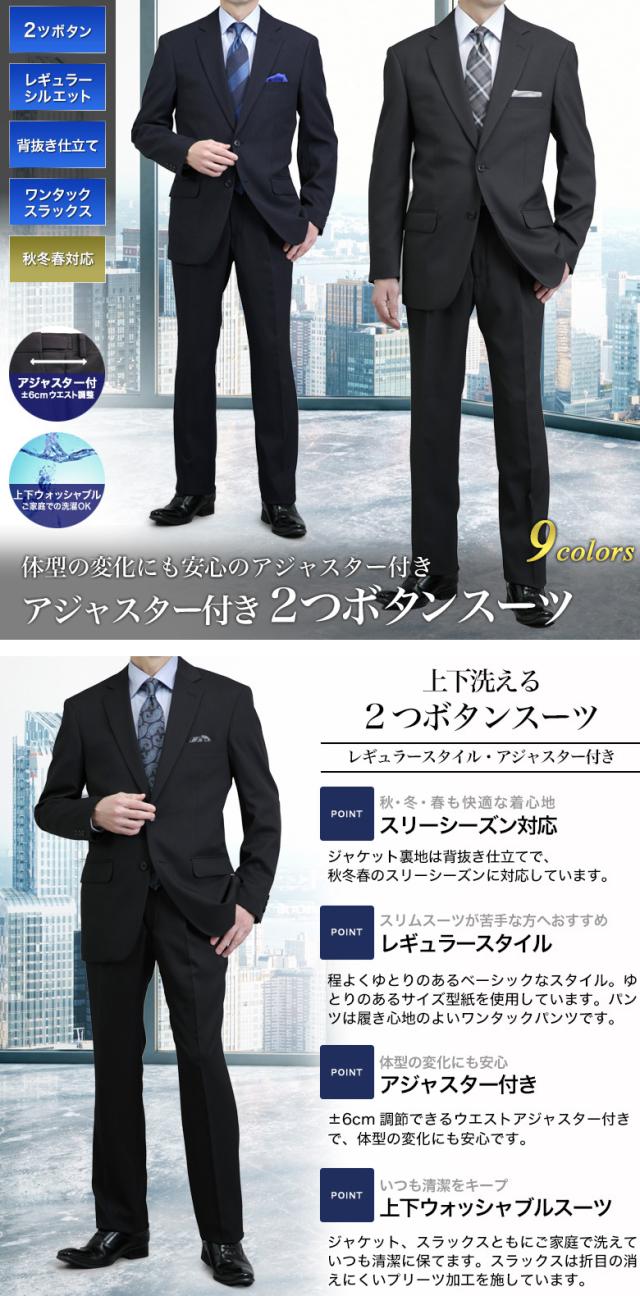 アジャスター付き スーツ メンズ 2つボタン ワンタック 背抜き仕立て 上下洗える ゆとり レギュラーフィット 秋冬春 スリーシーズン ビジネス ウエスト調整機能