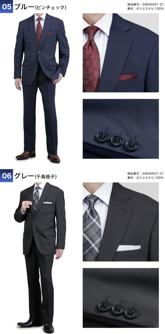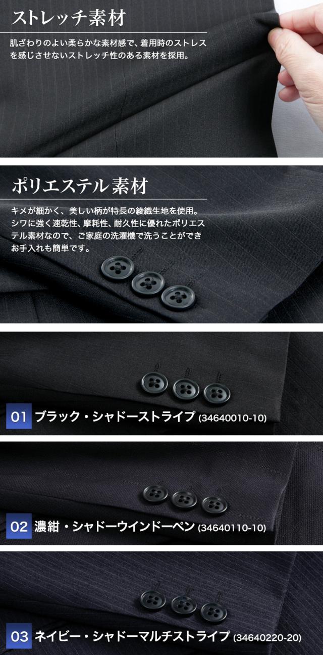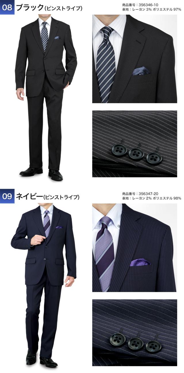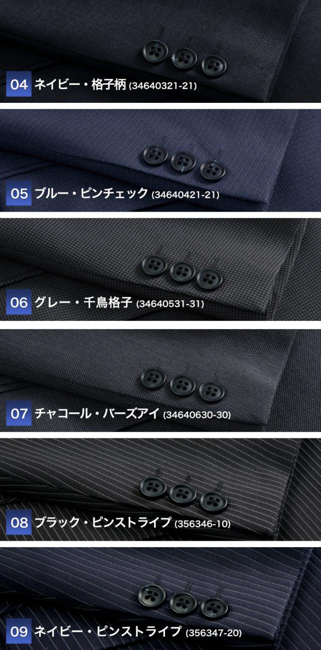 | 【01】ブラック・シャドーストライプ(34640010-10) 【02】濃紺・シャドーウインドーペン(34640110-10) 【03】ネイビー・シャドーマルチストライプ(34640220-20) 【04】ネイビー・格子柄(34640321-21) 【05】ブルー・ピンチェック(34640421-21) 【06】グレー・千鳥格子(34640531-31) 【07】チャコール・バーズアイ(34640630-30) 【08】ブラック・ピンストライプ(356346-10) 【09】ネイビー・ピンストライプ(356347-20) ※2025年9月より新しい色柄で販売しております |