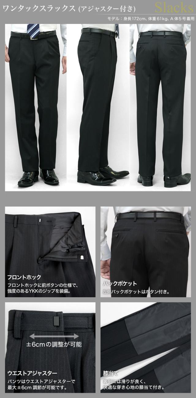| ▼ジャケット ・2ツボタン ・背抜き仕立て ・袖3ツボタン ・センターベント ▼スラックス ・ワンタック ・±6cmウエスト調節アジャスター付き ・膝裏付 ・プリーツ加工 ・綾織生地 ・上下とも洗濯機で洗えるウォッシャブルタイプ |