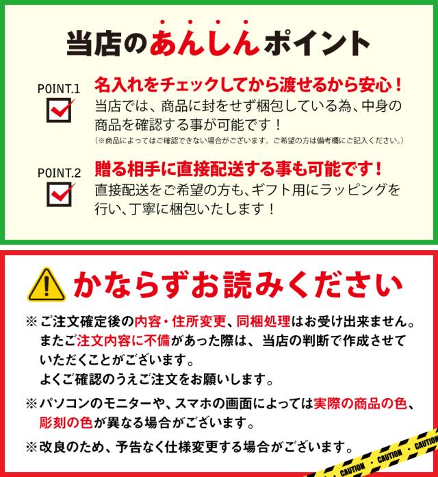 | 名入れ | 彫刻するお名前は「記入欄」へご記入下さい。 ローマ字のみ ※日本語不可 文字数は10文字までとさせていただきます。 |