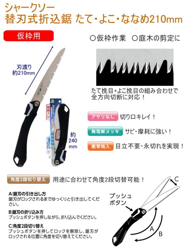 シャークソー 替刃式折込鋸 たて・よこ・ななめ アサリなし 210mm 仮枠用 日本製 送料無料 仮枠用 折込 SHARKSAW