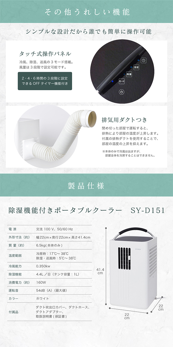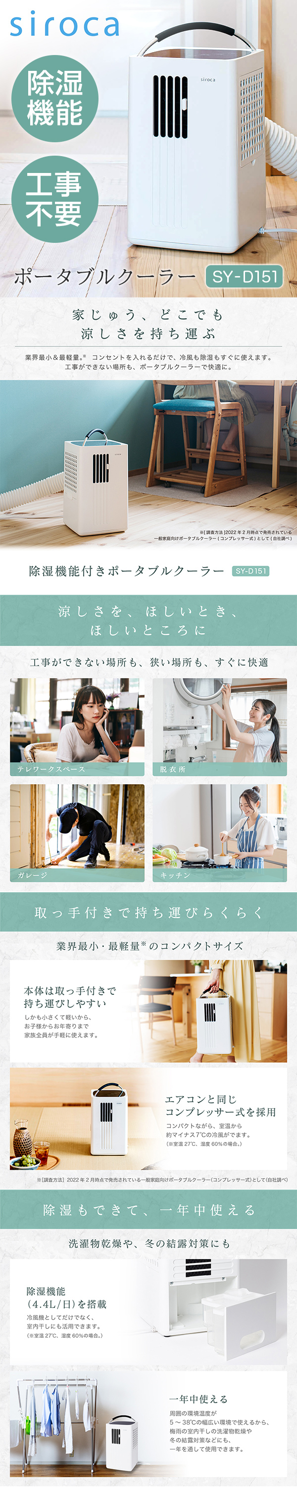 脱衣所やキッチンなどの工事が難しい狭い場所でも、本製品で涼しく快適な空間づくりをサポートします。また、1日4.4Lの除湿ができる除湿機能付きで、一年を通してお使いいただけます。