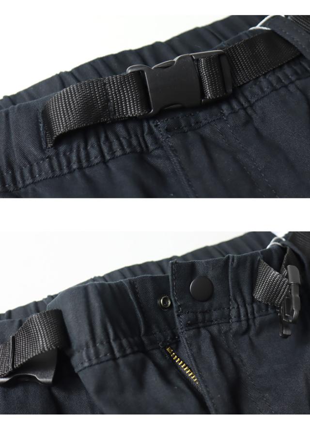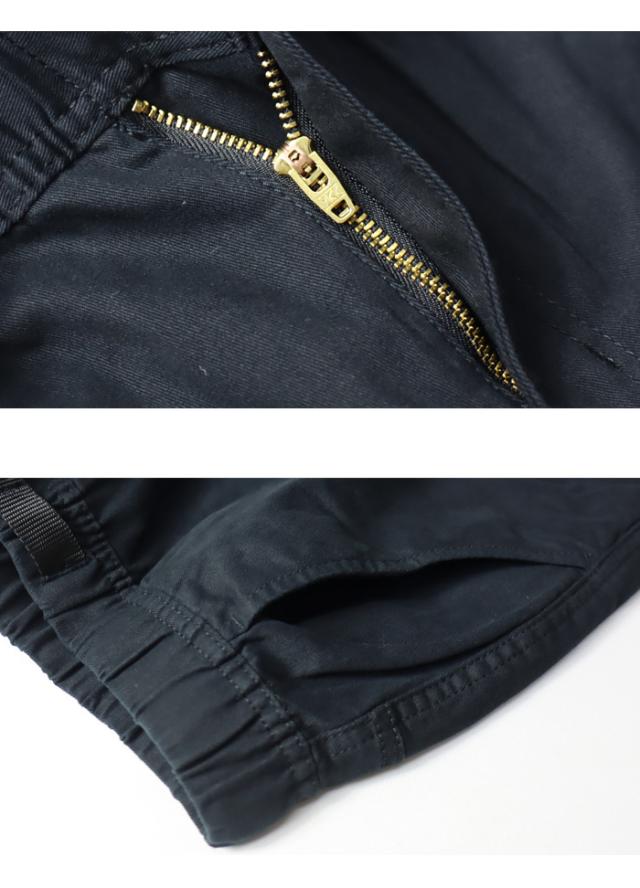 素材には、しなやかで柔らかく、程よい厚みのストレッチツイルを採用。ウエストはゴム仕様に調節用のウェビングベルトを装備、股部分はガゼットクロッチ。これが快適性と足運びの良さを実現します。左フロントポケット横の同色ロゴ刺繍と、右バックポケットの織りネームタグがアクセントになっています。