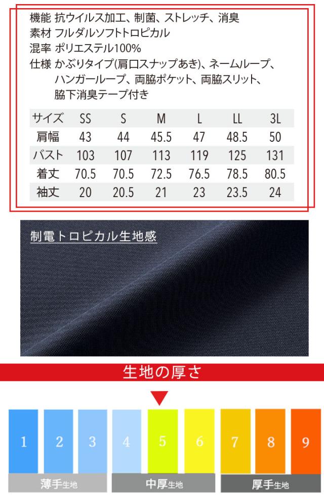 | 仕様 | ●かぶりタイプ(肩口スナップあき) ●ネームループ●ハンガーループ ●両脇ポケット●両脇スリット●脇下消臭テープ付き |