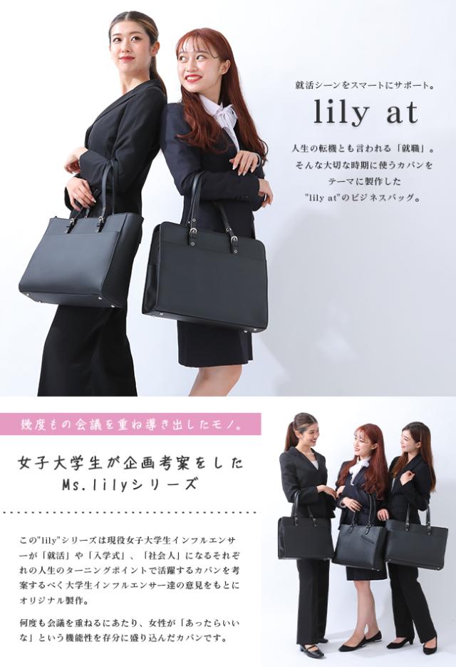 | 就活バッグ・ビジネスバッグ ブリーフ型「lily at 」 すっきりとしたフォルムの中にも、しっかりと機能面と収納力を持たせ、就活する人のためを思って作り上げたlily at。 あなたの就活シーンをスマートにサポートしてくれる、ブリーフケース型のリクルートバッグです。 荷物がしっかり収まる就活目線の収納スペース。よく使うA4書類やファイルが収納可能です。 モバイルバッテリーでの充電時に便利なコードホール付き。もはやスマホと電池切れを防ぐモバイルバッテリーは就活の必須アイテム。持ち運びと使いやすさにこだわりました。 長さ調節が可能なベルトタイプのハンドル。立ち上がりが3段階で調節でき、手持ちだけでなく肩掛けも可能。コートを着ているときや収納物が多くてバッグが重いときは、肩掛けスタイルで持てば負担が軽減できます。 また、ハンドルの先端は内部に収納でき、邪魔にならず見た目もスッキリ。 床に置いてもバッグが倒れにくい自立型で面接でも安心できる。底鋲付きで底部分が汚れるのを防いでくれます。 素材は、上品で落ち着いた質感のフェイクレザーを使用。 程よいツヤ感は、持つ人の品位を落とすことなくワンランク上に格上げしてくれます。 現役女子大学生インフルエンサーとの共同開発 "Ms.lily"シリーズは現役女子大学生インフルエンサーが「就活」や「入学式」、「社会人」になるそれぞれの人生のターニングポイントで活躍するカバンを考案するべく大学生インフルエンサー達の意見をもとにオリジナル製作したカバン。女性が「あったらいいな」という機能性を存分に盛り込んだバッグです。 |