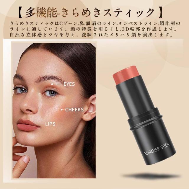 ●きらめきスティックは光が自然に当たる顔の高い部分、頬骨、眉の骨の下、鼻筋、上唇に適しています。顔の特徴を明るくし、3D輪郭を作成します。自然な立体感とツヤを与え、 洗練されたメリハリ顔を演出します。