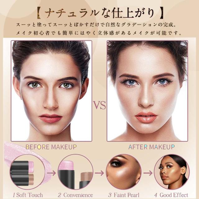 ●きらめきスティックは光が自然に当たる顔の高い部分、頬骨、眉の骨の下、鼻筋、上唇に適しています。顔の特徴を明るくし、3D輪郭を作成します。自然な立体感とツヤを与え、 洗練されたメリハリ顔を演出します。 ●塗り心地がいいハイライトスティックで、自然なつやっと明るく立体感を演出。シェーディングで、自然な陰影と小顔効果。カラースティックで血色感のある肌に仕上げます。 ●長持ちするウォータープルーフでベタつきません。汗でにじんだり色あせたりすることなく、一日中メイクアップが持続します。 ●スーッと塗ってスーッとぼかすだけで自然なグラデーションの完成。メイク初心者でも簡単にはやく立体感があるメイクが可能です。