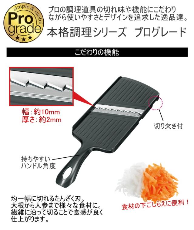 ご家庭にプロの料理を。本格調理シリーズ、プログレード。 プロの調理道具の切れ味や機能にこだわりながら使いやすさとデザインを追求した逸品。 幅約10mmの均一なたんざく切りができる。(厚さ約2mm) 大根から人参まで様々な食材の下ごしらえに便利です。 繊維に沿って切ることで食感が良く仕上がります。 持ちやすいハンドル角度。 ボウルのフチにセットできる切り欠き付き。 ■その他のプログレードシリーズはこちら↓ プログレード |
