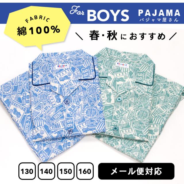 パジャマ キッズ 男の子 綿100% 長袖 春 秋 前開き ボタン バイク柄 ブルー グリーン 130 140 150 160 子供 ジュニア ボーイズ おそろい メール便なら 送料無料