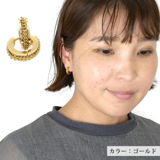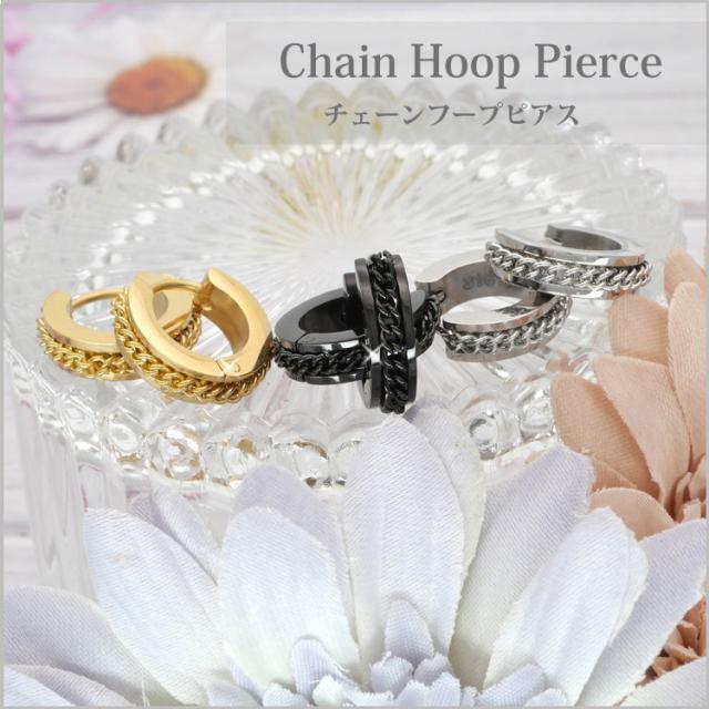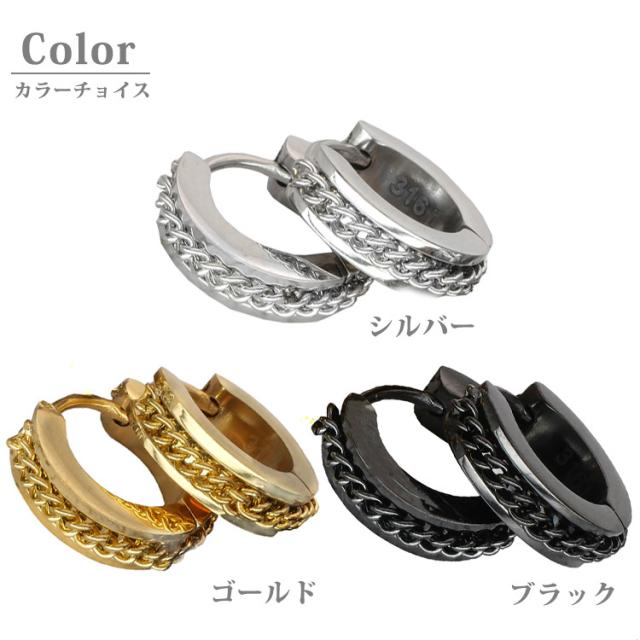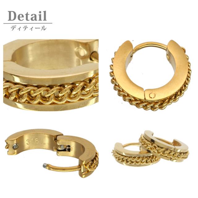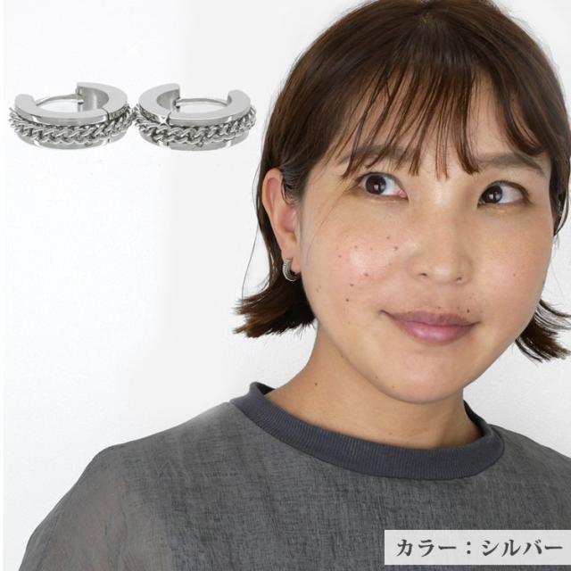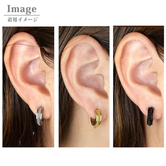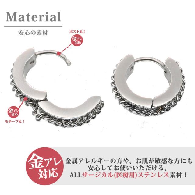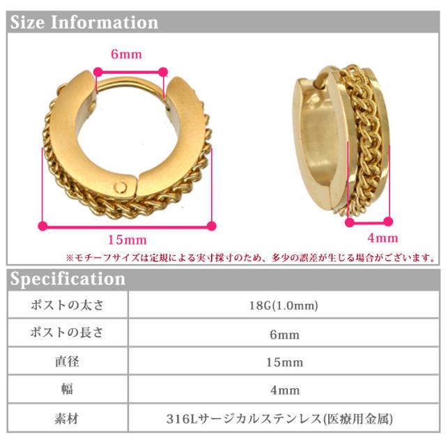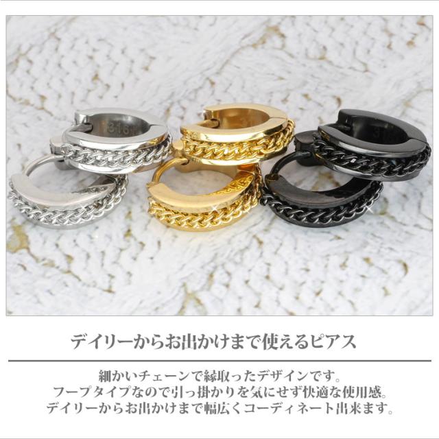 細かいチェーンで縁取ったデザインです。フープタイプなので引っ掛かりを気にせず快適な使用感。デイリーからお出かけまで幅広くコーディネート出来ます。素材には金属アレルギーの方にも安心なサージカルステンレスを使用! 汗をかいても痒くならず、長時間のご使用も安心です。 時間がたっても変色や変形しにくく、金属の輝きが色あせません。