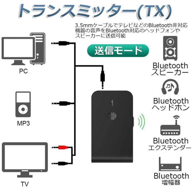 【一台二役】本製品は送信と受信の両方に使用可能なBluetoothオーディオトランスミッター&Bluetoothオーディオレシーバーです。送信機モードや受信機モードはワンタッチで簡単切替えできます。送信機(TXモード):Bluetoothに対応していない携帯オーディオプレイヤーやテレビと繋いで、Bluetooth対応のスピーカーやヘッドセットなどと接続ができます。受信機(RXモード):Bluetoothに対応していないイヤホンやヘッドホンを繋いで、Bluetooth対応のスマートフォンや携帯オーディオプレイヤーなどと接続ができます。※通話はできます。【多機種対応&Bluetooth V5.0】一般的な3.5mmイヤホンジャックを採用しているので、3.5mmプラグ/ジャックのイヤホンやオーディオ機器(TV、パソコン、カーオーディオなど)に対応します。また、Bluetoothバージョン5.0では通信速度、範囲、容量がそれぞれ大幅に向上したことで、遅延を最小限に抑え、映像と音声の時間差を感じること無く快適に楽しめます。Bluetoothに対応していないテレビに最適です。