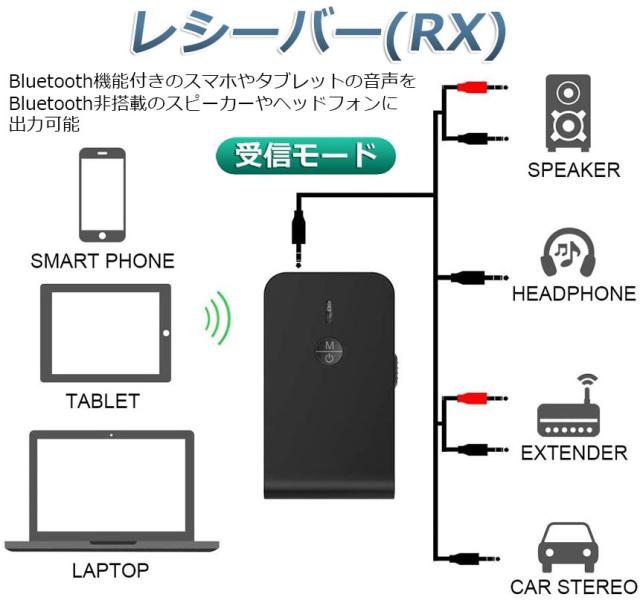 【一台二役】本製品は送信と受信の両方に使用可能なBluetoothオーディオトランスミッター&Bluetoothオーディオレシーバーです。送信機モードや受信機モードはワンタッチで簡単切替えできます。送信機(TXモード):Bluetoothに対応していない携帯オーディオプレイヤーやテレビと繋いで、Bluetooth対応のスピーカーやヘッドセットなどと接続ができます。受信機(RXモード):Bluetoothに対応していないイヤホンやヘッドホンを繋いで、Bluetooth対応のスマートフォンや携帯オーディオプレイヤーなどと接続ができます。※通話はできます。
