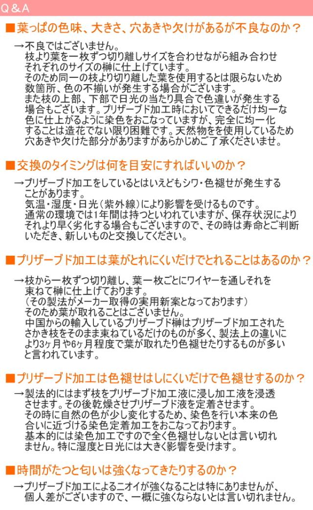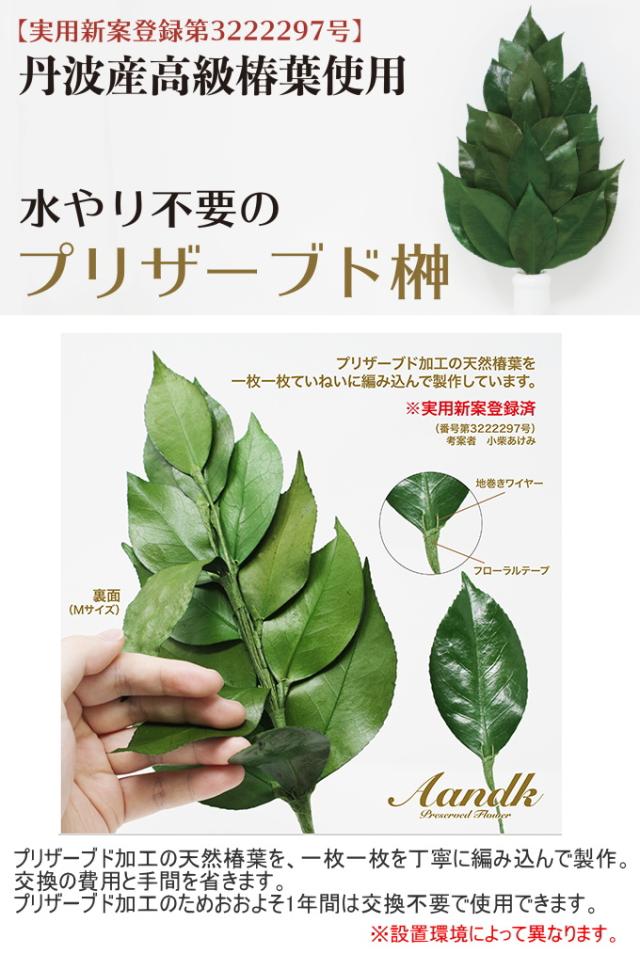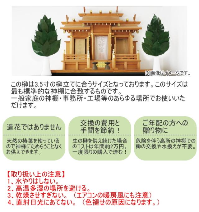 | 特徴 | プリザーブド加工の天然椿葉1枚1枚にワイヤーを通し、神棚に飾る榊として美しい形になるように成形した榊です。 ※実用新案登録済(番号第3222297号) 国産の椿葉を使用しているため、外国産にありがちな、枯れる、葉が丸まる、しおれるということがほとんどなく、適した環境に保管できれば1年以上美しい状態を保てます。 水やりが不要なので、水が腐るニオイもなく清潔。 特に高い場所にある神棚の場合、水換えは手間のかかる作業ですがそれも必要ありません。 造花(シルクフラワー)とは異なり、本物の生木を保存加工したものだから、神様にためらうことなくお供えできます。 この榊は3.5寸の榊立てに合うサイズとなっております。 このサイズは最も標準的な神棚に合致するものです。 一般家庭の神棚、事務所、工場等のあらゆる場所でご使用いただけます。 ご年配の方へのプレゼントにもおすすめです。 【注意】 ※天然物を使用していますので多少大きさ・形・色味など若干異なる場合がございます。多少のキズや小さな虫喰いによる穴などある場合もございますが、自然のものですのであらかじめご了承ください。 ※設置環境によりきれいに保存できる期間は異なります。 |