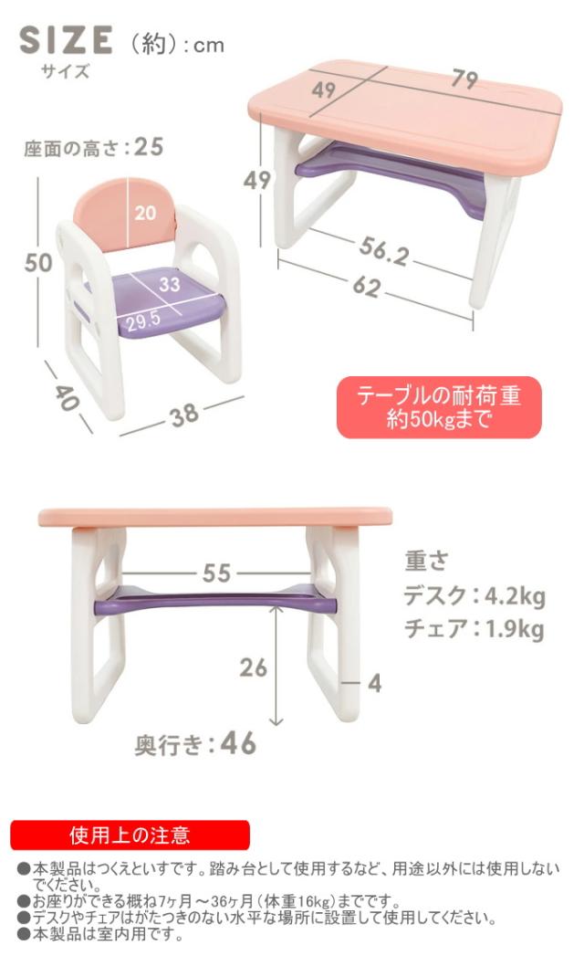 本製品は室内用です。 がたつきのない水平な場所に設置してください。 本製品は机といすです。踏み台として使用するなど、用途以外には使用しないでください。 必ず遊ぶ前に商品がしっかり組み立てられているか、ガタつきがないか確認してください。 |