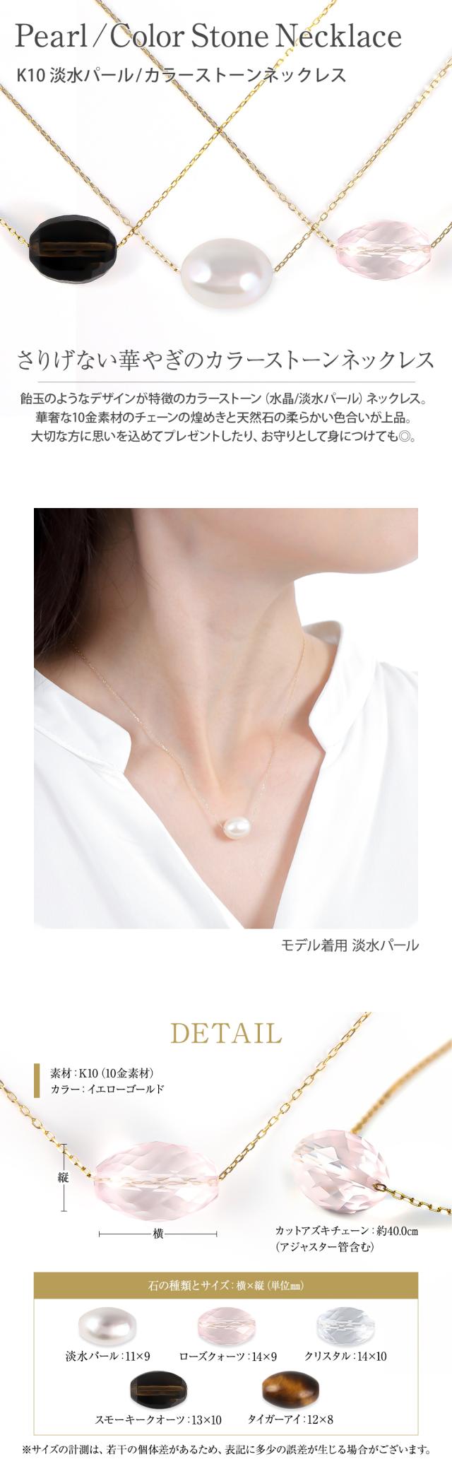 飴玉のようなふっくらとしたデザインが可愛らしいカラーストーン(淡水パール/水晶)ネックレス。K10素材のチェーンとの組み合わせは、さりげない輝きでお守りとして身につけても。誕生日のギフトや、記念日の贈り物に。10金素材で金属アレルギーに対応しているので、お肌に優しく安心です。