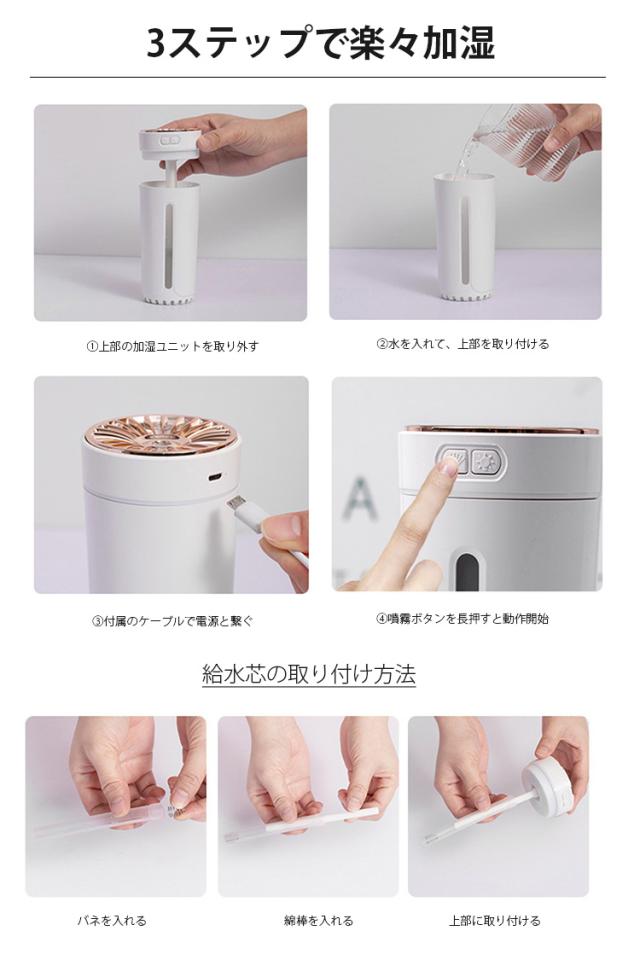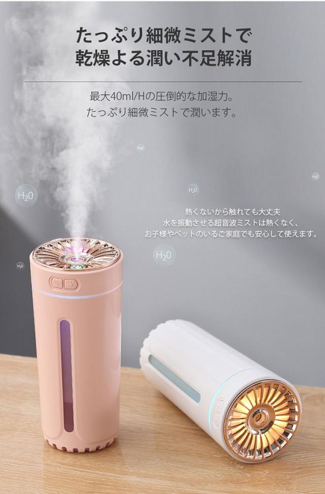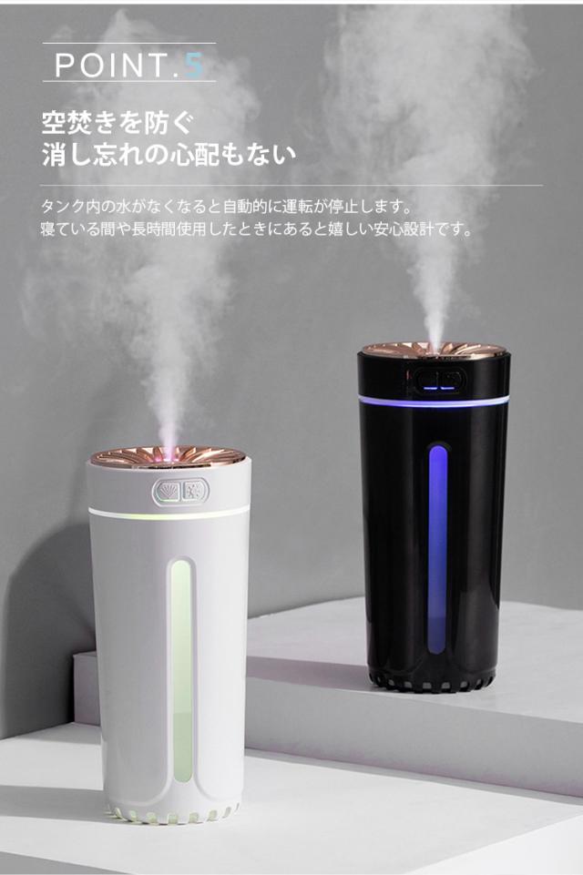 - コードレスでどこでも使えるのが便利!USB-C充電式なので充電も早いです。ミストが細かく、乾燥したオフィスで大活躍しています。7色のナイトライトが優しく光って癒し効果も◎。静音で寝室にもぴったりです。