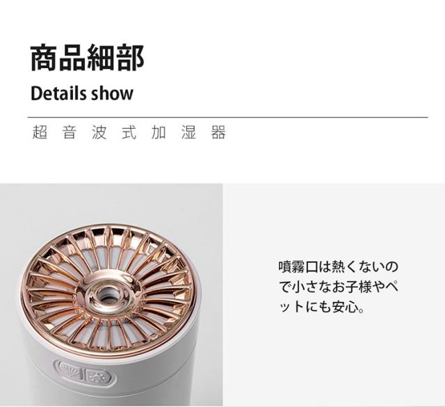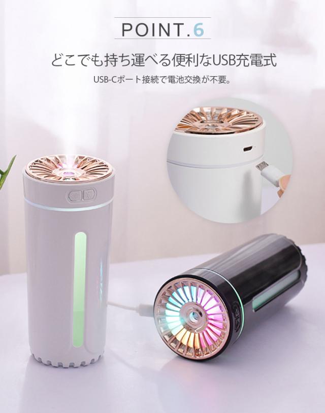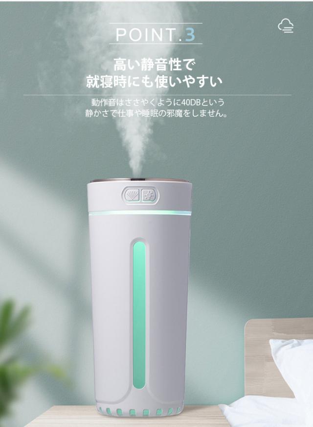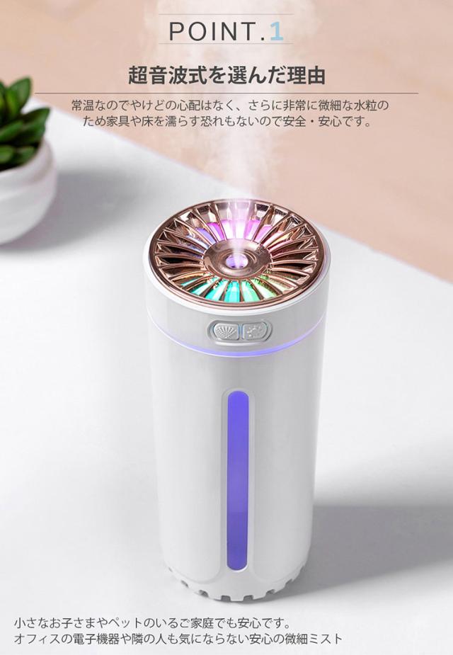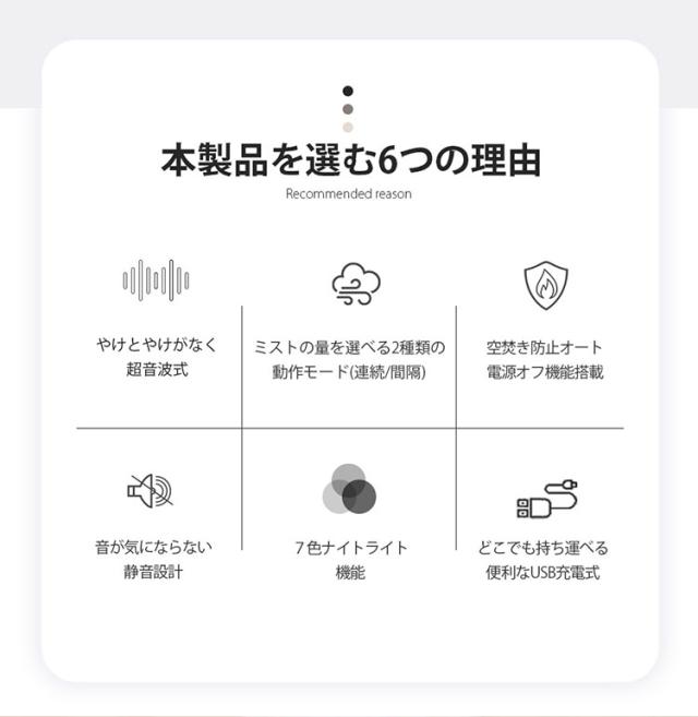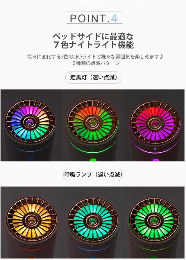 - 静音設計で夜中に使っても全く気になりません。7色のライトも綺麗で癒されます。充電式なのが本当に便利です