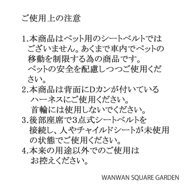 1.本商品はペット用のシートベルトではございません。あくまで車内でペットの移動を制限する為の商品です。