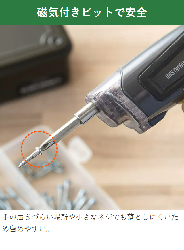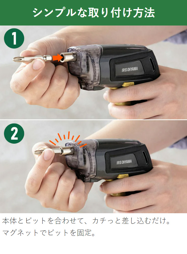 ビットの取り付けは、本体と使用したいビットを合わせてカチッと差し込むだけ。マグネットでビットを固定するので取り付け簡単です。