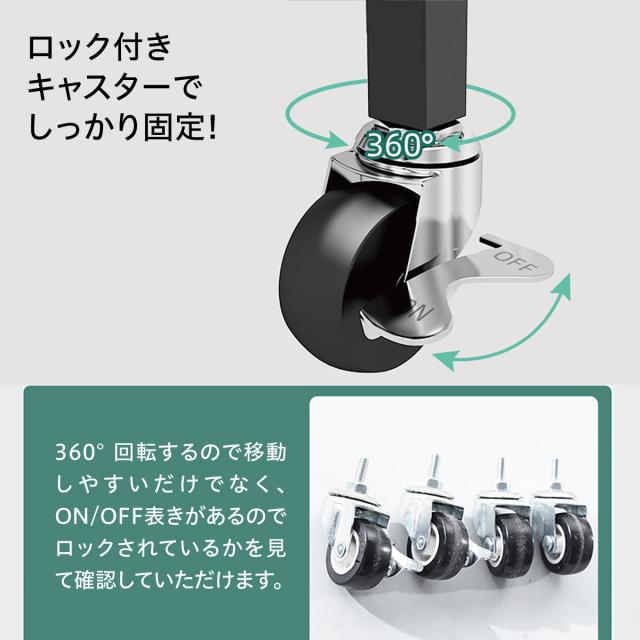 【ロック付きキャスターでしっかり固定!】360°回転するので移動しやすいだけでなく、ON/OFF表記があるので、ロックされているか見て確認していただけます。