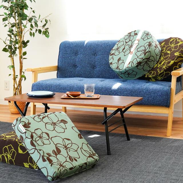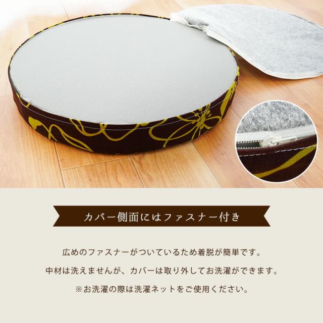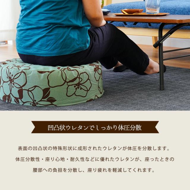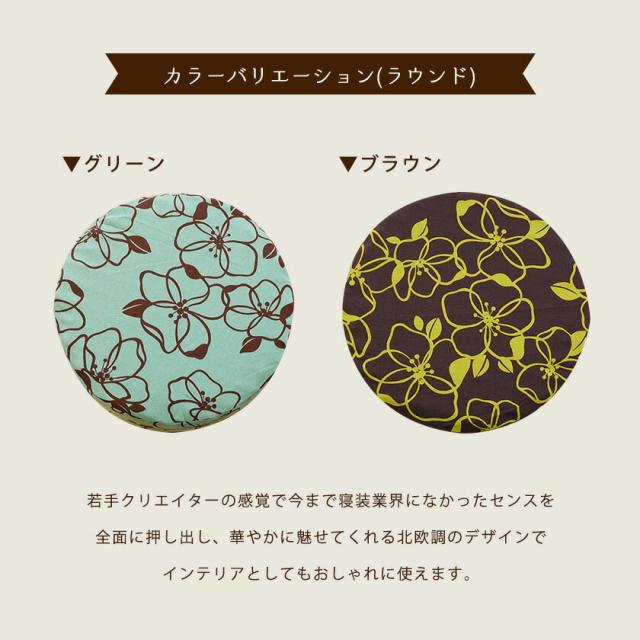 [ keyword | 座り疲れをラクにするシートクッション 「ラインフラワー」 座布団 約45R×15cm ラウンド ハイタイプ 綿100% 花柄 パターン 北欧調 円形 グリーン ブラウン 日本製 在宅勤務 在宅ワーク リモートワーク テレワーク ]