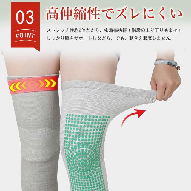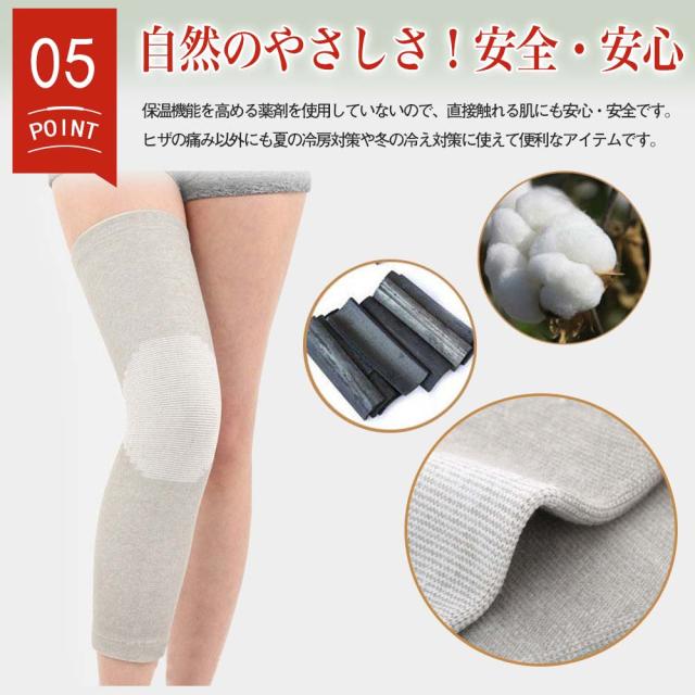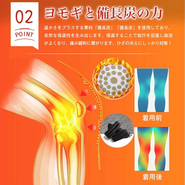 ●厚手タイプは温かさをプラスする素材「ヨモギ」「竹炭」を使用しており、自然な保温性を生み出し、血行を促進し血流がよくなり、膝にかかる負担を減らせます。