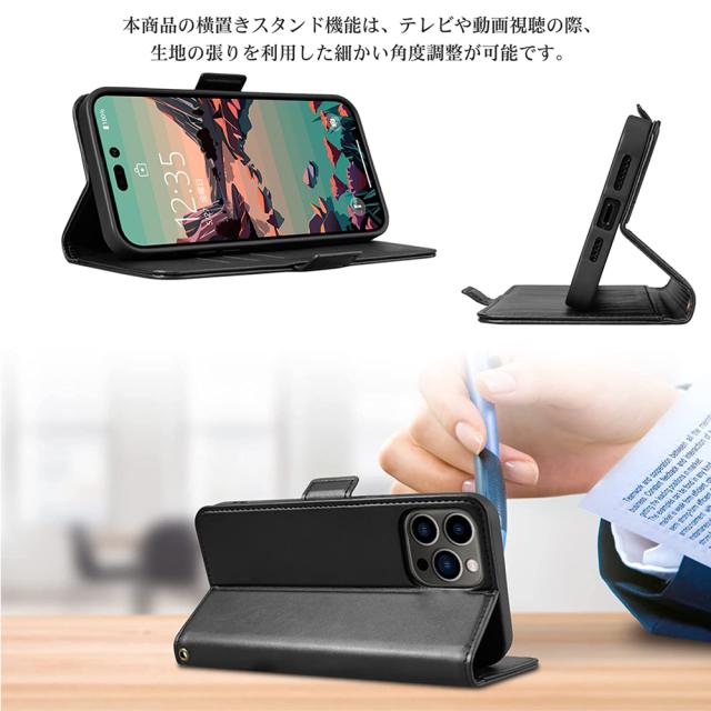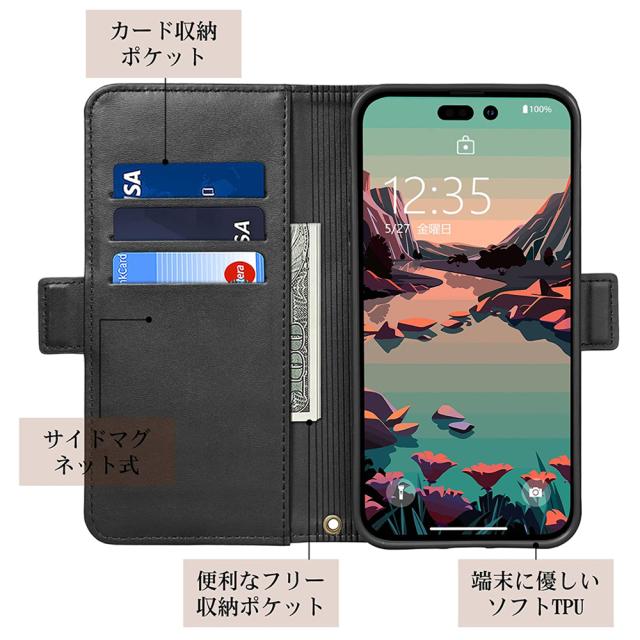 使い勝手抜群、手帳型カバーの機能を搭載して、内側には三つのカード入れとフリーポケットがつき、カードや定期券の収納に優れて、横置きにしてスタンドになり、動画視聴がすごく便利なスマホケースです。