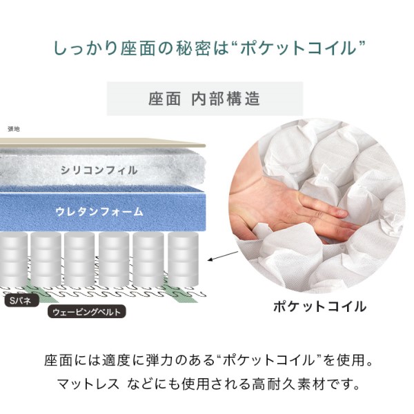 中材:ポケットコイル・Sバネ・シリコンフィル綿・チップウレタン 脚