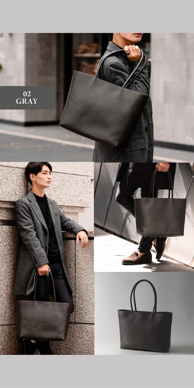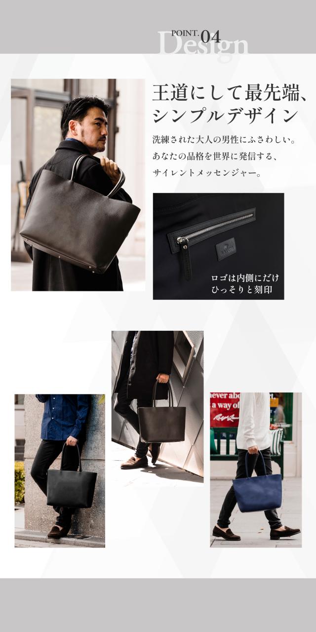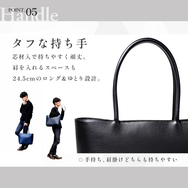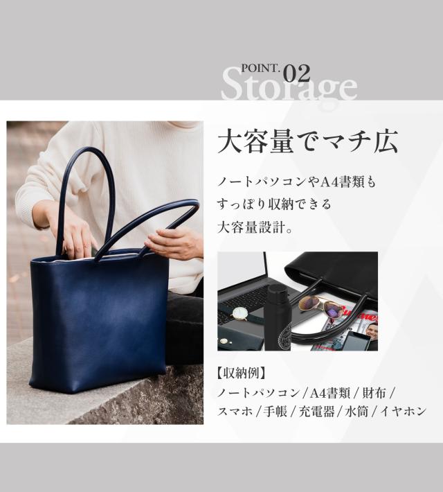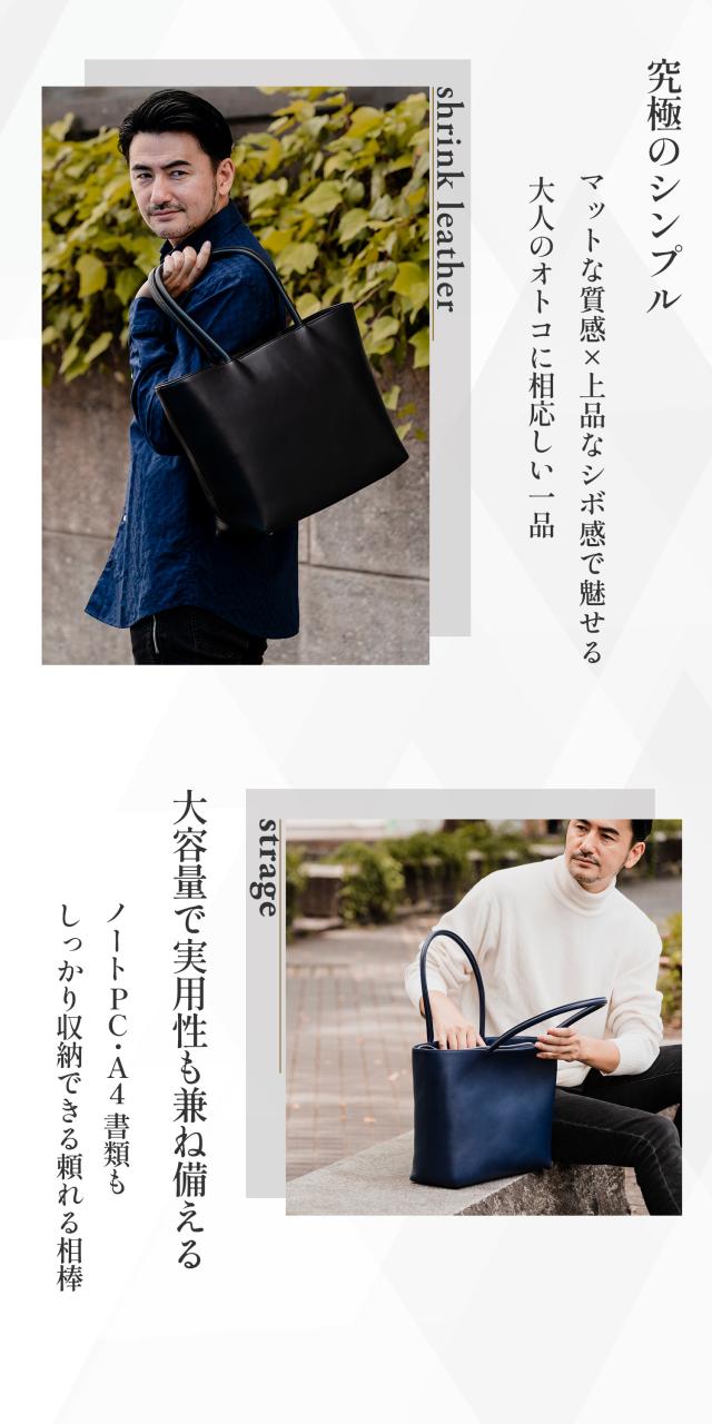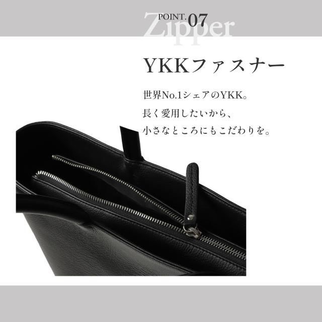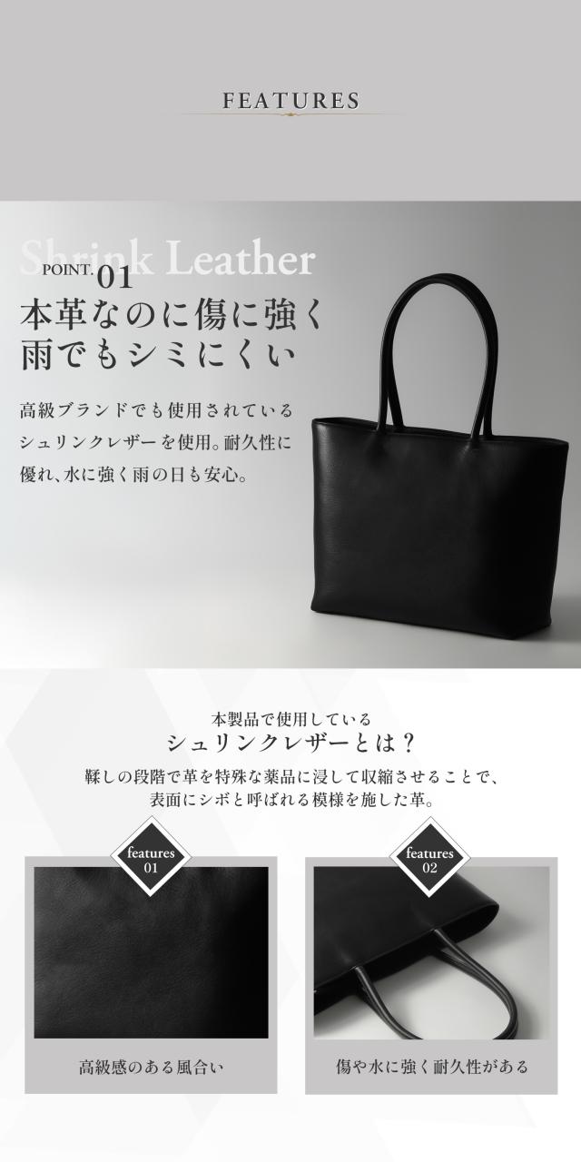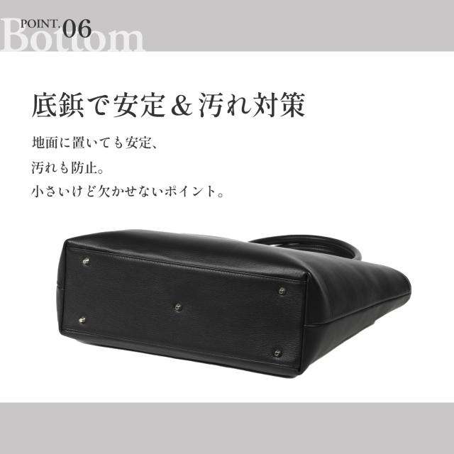 パソコン収納したままでも自立。底鋲付きのため、汚れづらい。持ち手が少しが長いため、スムーズな持ち歩き。固い持ち手でへたらずに地面に置いた時もサッと取れる。YKKファスナーで耐久力が高い。シュリンクレザーのため、傷がつきにくく、水に少し強い。