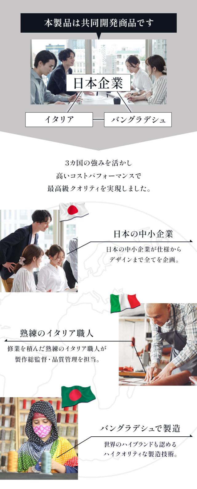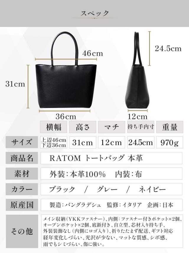三国共同開発(監修:イタリア、企画:日本、製造:バングラデシュ) 本体サイズ:上辺46cm-下辺36cm*高さ31cm*マチ12cm 重量:970g 持ち手の高さ:34cm