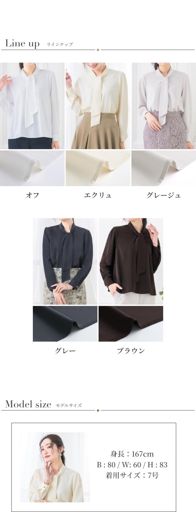 きれいめで大人フェミニンな着こなしが叶う、人気のボウタイブラウスがリニューアル! カフス袖にはゴールドのスクエアボタンをあしらい、手元にさりげない知性と華やぎをプラスしました。 背中にはタックを施し、動いたときもラインが崩れにくい端正な後ろ姿に。 細部まで美しく整えた仕上がりです。 生地にはさらっとした柔らかい肌触りの素材を使用しました。 シワになりにくく、程よいハリ感となめらかさがあり「きちんと見え」を長時間キープ。 毛玉になりにくい点も日常使いしやすいポイントです。 一枚着としてはもちろん、ジャケットのインナーとしても存在感があり、上品に着映えします。 オフィスやデイリーシーンはもちろん、セレモニーなどのフォーマルな場にも活躍する一着です。 |
