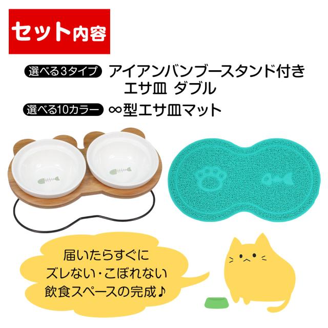 えさ皿 ランチョンマット ∞型 セット 猫 犬 食器 えさ 皿 餌入れ フードボウル ペット ご飯皿 水飲み マット 食べやすい 傾斜 餌皿 エサ入れ 滑り止め 陶器 アイアンバンブースタンドダブル