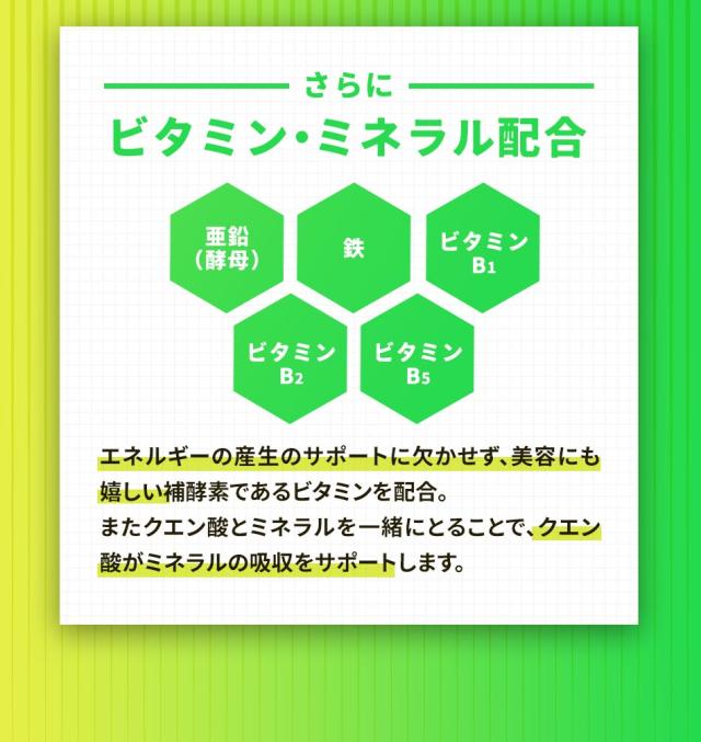 主要原料(1粒あたり):クエン酸 100.2mg / 梅肉エキス末(デキストリン、梅肉ペースト、梅酢) 75mg / 酵母(亜鉛含有) 14.67mg / ピロリン酸第二鉄 4.59mg/